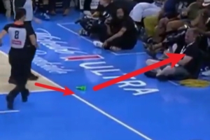 比赛期间,有球迷再次往场内扔了一个绿色的假阳具,裁判当即中断比赛,女裁判伸脚将假阳具一脚踢飞。