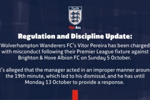 日前,英足总官方发布公告:“狼队主帅佩雷拉在10月5日周日对阵布莱顿的英超联赛后被指控行为不当。据称,佩雷拉在第19分钟左右行为不当,这导致他被罚下场,他需在10月13日周一前对此作出回应。”