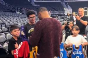 体育资讯10月20日讯 美媒昨日晒出视频,威少为小球迷们签名,签了雷霆与火箭的,唯独略过了湖人的。