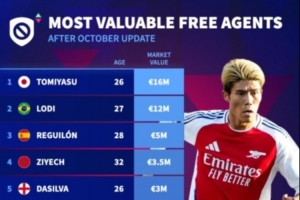 自由球员身价榜:富安健洋1600万欧居首,雷吉隆、齐耶赫在列
