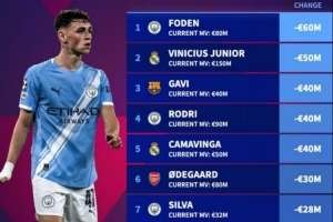 2025年身价跌幅榜:福登-6000万欧居首,维尼修斯-5000万欧次席