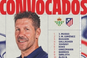 马竞客战贝蒂斯大名单:阿尔瓦雷斯、格列兹曼领衔,卡尔多索回归