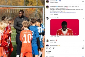 于帕也在今日现身拜仁U13青训营和小球员们进行沟通交流,他也晒出自己的互动照,并配文:“足球不仅仅是一项运动:它还关乎分享、尊重和激情❤️很荣幸成为Playse品牌大使,并与拜仁慕尼黑U13球员和Playse携手共进。”